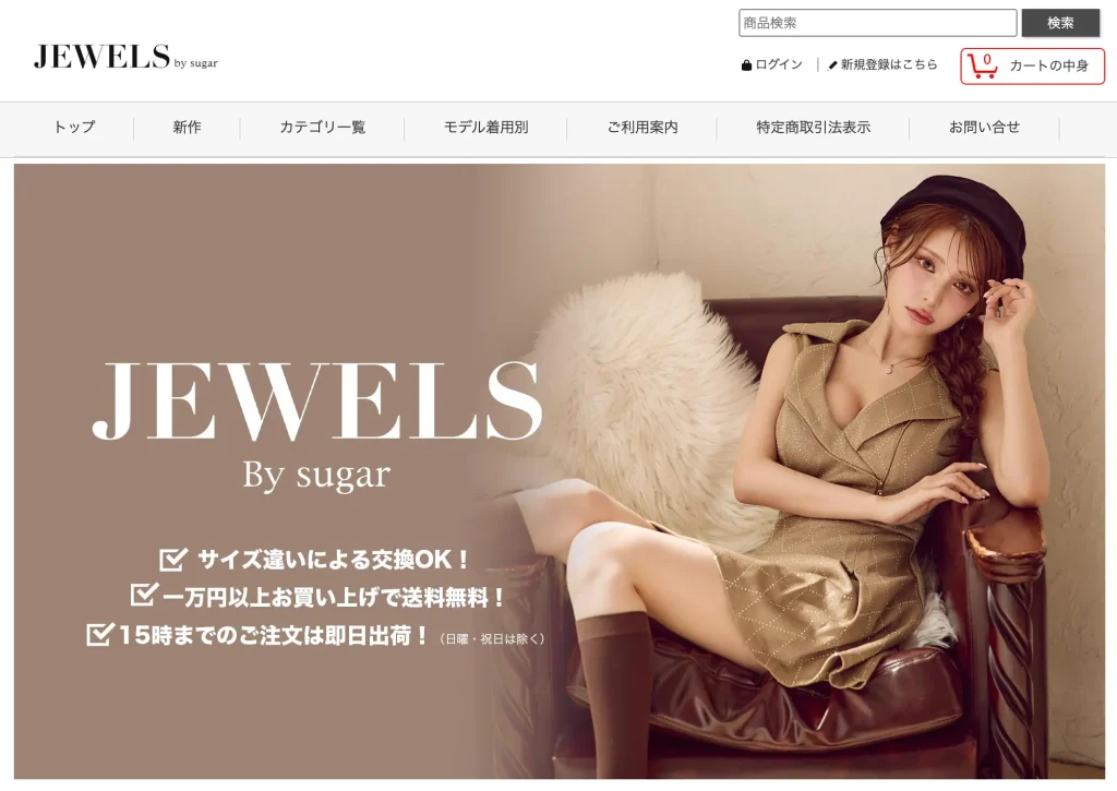 Jewels(ジュエルズ)も、Tikaと同じく甘めでガーリーなデザインを得意とする通販サイトです。キラキラしたビジューやレースをふんだんに使った、まるでお姫様のようなドレスがたくさん見つかります。 価格帯はプチプラが中心で、とにかく「女の子らしくて可愛い」を追求したい日にぴったりの一着が見つかるはず。新作の更新頻度が少しゆっくりめなので、定期的にサイトをチェックしてお気に入りの一着を見つけてみてください。