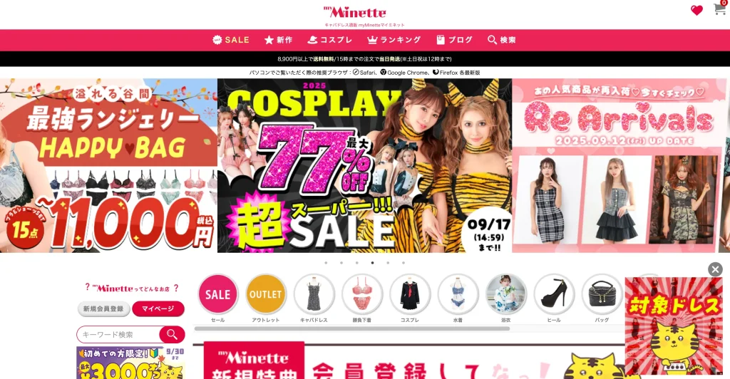 「まだ始めたばかりで、とにかく安くドレスを揃えたい!」そんな新人キャバ嬢さんの強い味方になってくれるのがmyMinette(マイミネット)です。業界最安値レベルを謳うだけあって、驚くような価格でドレスが販売されています。 まずは数を揃えたい、という時期には非常に頼りになるサイトです。デザインはシンプルなものが多いですが、その分、アクセサリーやヘアメイクで自分らしさを演出しやすいとも言えます。まずはお試しで、という気持ちで気軽に購入できるのが最大の魅力です。